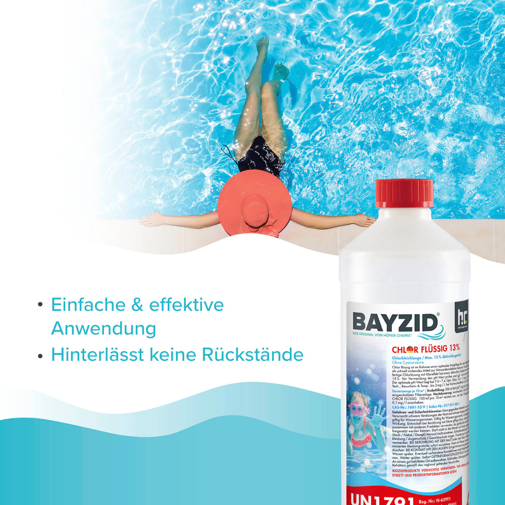 Die gebrauchsfertige BAYZID® Flüssigchlor-Lösung von Höfer Chemie ist ein schnell wirkendes Desinfektionsmittel mit Klareffekt und einem 13 - 15 % Aktivchlorgehalt. So können Sie Ihr Schwimmbad zuverlässig von Bakterien befreien und den Chlorgehalt im Pool schnell oder auch langfristig anheben.