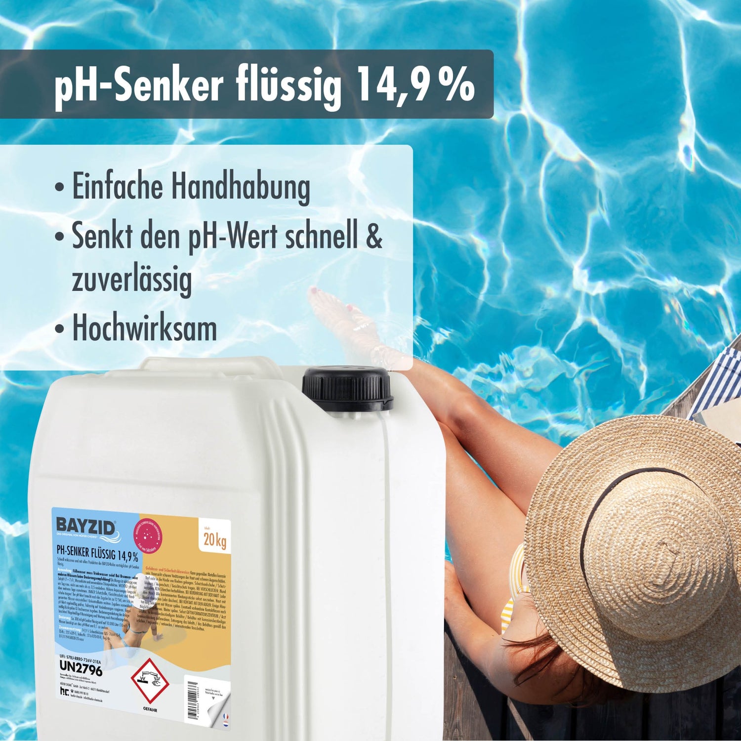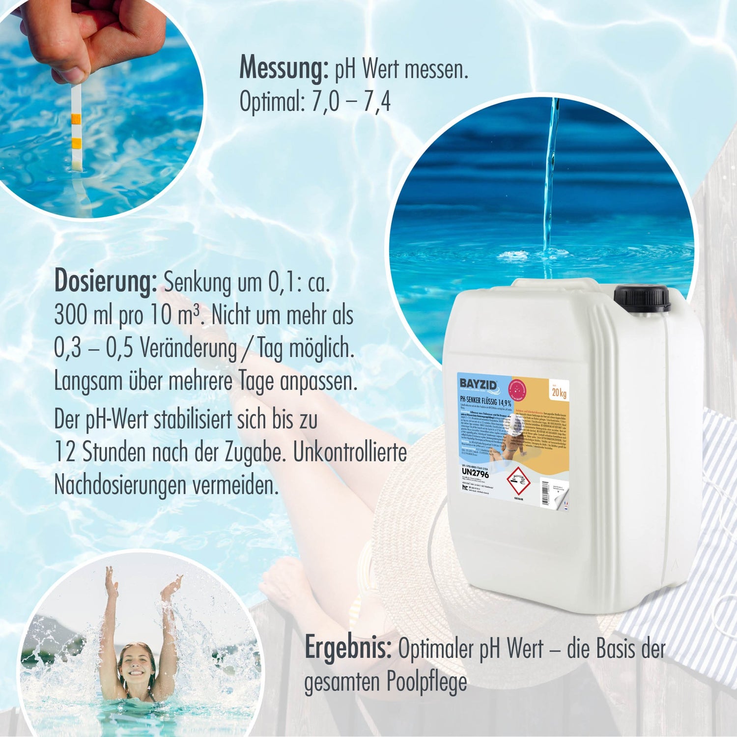 Schnell wirksamer und mit allen Produkten der BAYZID Reihe verträglicher pH Senker flüssig. Dieses flüssige pH Minus ist nicht nur effektiv, sondern auch lagerstabil und besonders rein. BAYZID pH Senker flüssig entspricht den Anforderungen der DIN EN 15078 (Produkte zur Aufbereitung von Schwimm- und Badebeckenwasser).