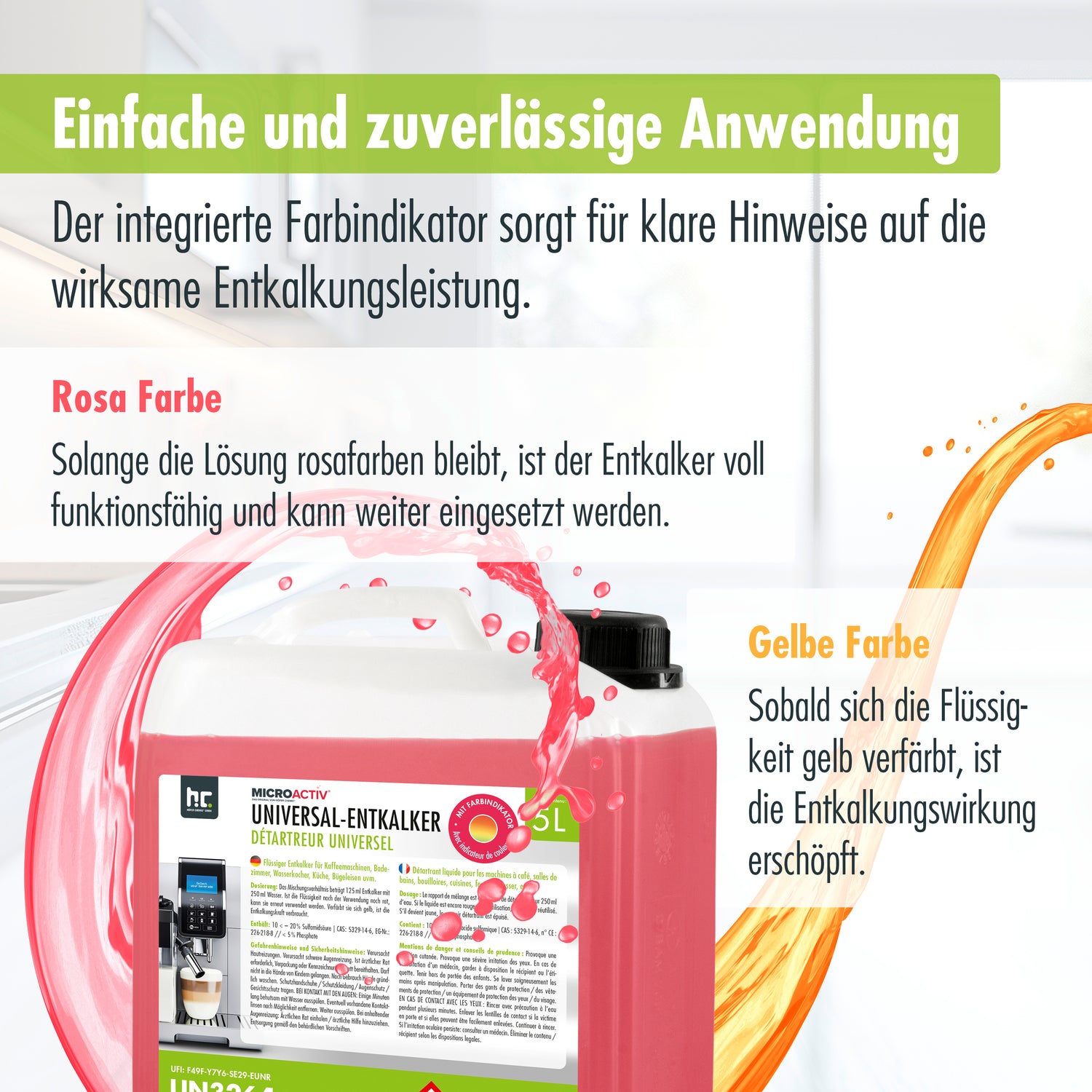 Ist die Flüssigkeit nach der Verwendung noch rot, kann sie erneut verwendet werden. Verfärbt sie sich gelb, ist die Entkalkungskraft verbraucht und sie kann entsorgt werden. So verhilft Ihnen der Farbindikator zu einer effektiven und kostensparenden Reinigung Ihrer Haushaltsgeräte.