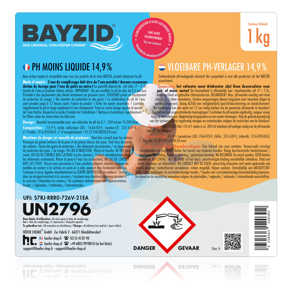 1 kg BAYZID® pH Minus flüssig 14,9% für Pools in Flaschen 1 kg pH Minus Senker 14,9%