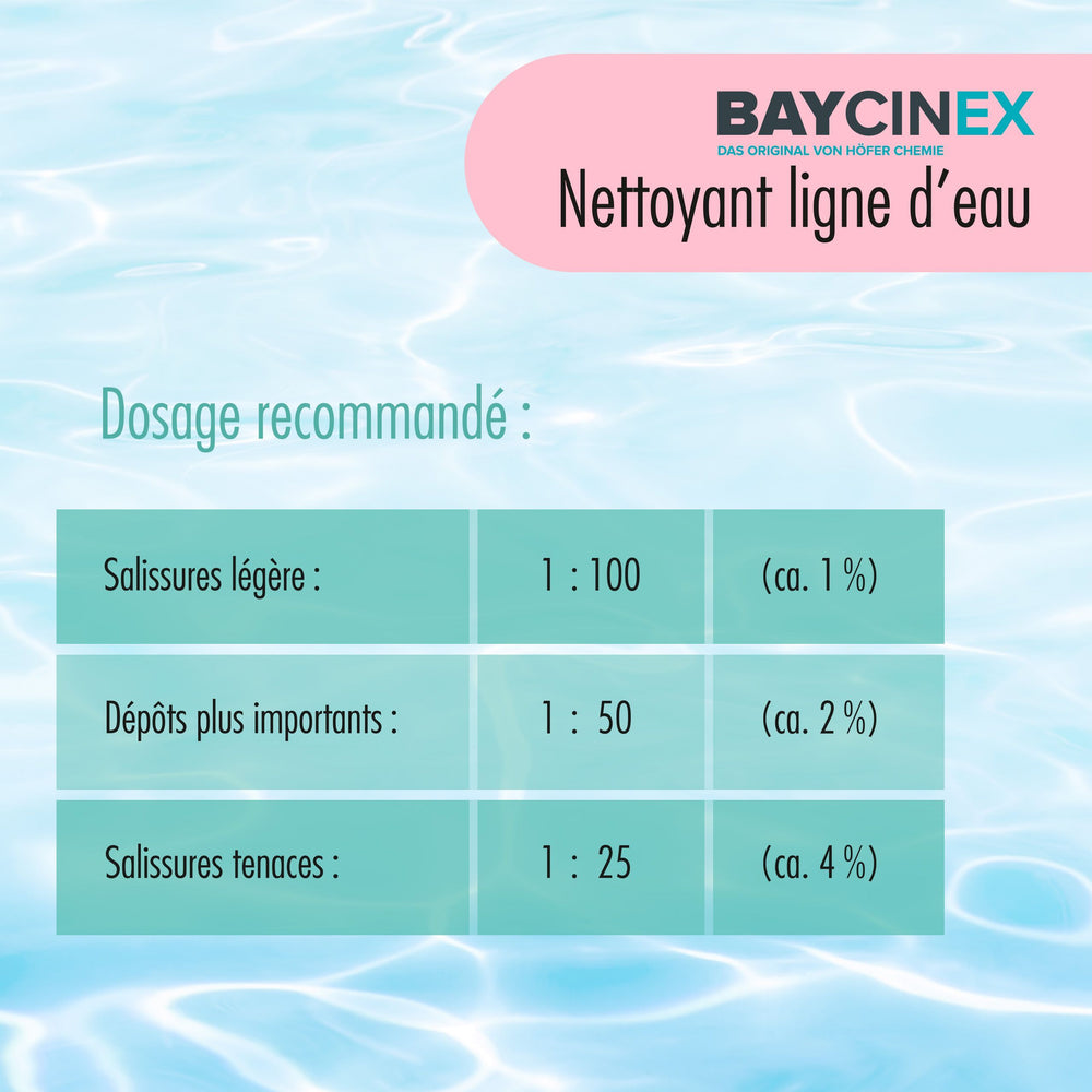 Je nach Grad der Verunreinigungen wird der alkalische Poolreiniger im Verhältnis von 1 : 25 bis 1 : 100 mit Wasser verdünnt, so dass eine Konzentration von Pool Beckenrandreiniger mit 1 – 4 Prozent entsteht. Nach der Anwendung werden die keimfrei sauberen Beckenränder mit ausreichend klarem Wasser gespült.