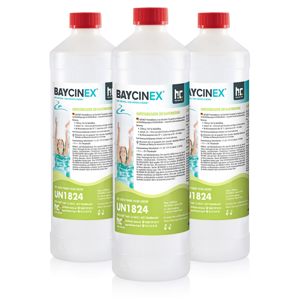 BAYCINEX® Härtestabilisator zur Kalkvermeidung ist ein chlorstabiles Flüssigmittel zur Verhinderung von Kalk- und Metallablagerungen an den Pool Oberflächen. Baycinex® Härtestabilisator zur Kalkvermeidung ist kompatibel mit allen Desinfektionsmethoden.