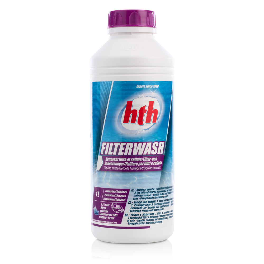 hth® FILTERWASH ist ein vielseitiges Reinigungsmittel für Schwimmbäder, das nicht nur für Sand- und Kartuschenfilter geeignet ist, sondern auch zur Reinigung von Salzelektrolysezellen verwendet werden kann.