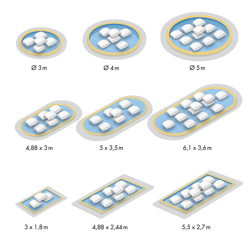 Höfer Chemie Pool Winterkissen sind überaus robust und können im Salzwasserbecken genauso verwendet werden wie im gechlorten Süßwasserpool. Aufgeblasen sind die Poolluftkissen 122 x 122 x 55 cm groß, sodass je nach Poolgröße etwa sieben bis 20 Poolkissen für den Winter benötigt werden. Der nachfolgenden Grafik entnehmen Sie ganz einfach, wie viele Poolpolster für welches Becken erforderlich sind können Sie den Produktbildern entnehmen.