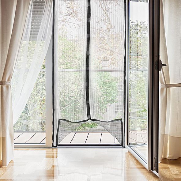 Während die Seitenteile rechts und links von der Tür befestigt werden, wird das Netz in der Mitte mit Magneten geschlossen. So fügen sich die Hälften durch die Magnetwirkung automatisch wieder zusammen, sobald man hindurchgegangen ist.