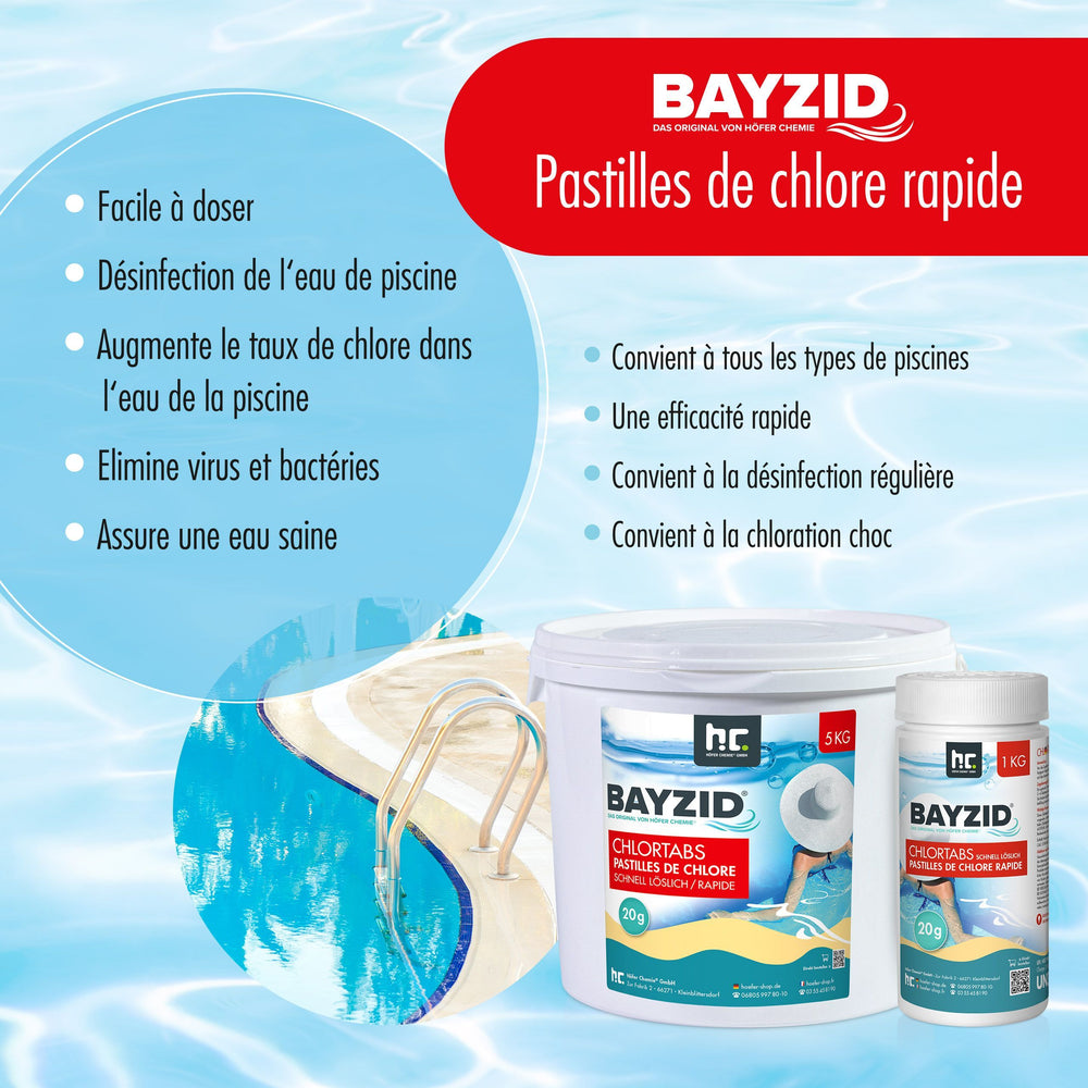 Die 20gr. schnell-löslichen-Tabletten sind ausschließlich für die Zugabe in den Skimmer bei laufender Umwälzanlage vorgesehen. Ist kein Skimmer vorhanden, erfolgt die Zugabe über ein “Eingieß-Behältnis“, (mit Schutzbrille und Handschuhe!) in dem die Tabletten aufgelöst und dem Becken unter der Verwendung des Eingieß-Behältnis über der Wasseroberfläche - bei laufender Filteranlage zugegeben werden. Achten Sie auch hier darauf, dass keine Tabletten-Stücke oder Pulverreste auf den Becken-Boden sinken und dadurch Bleichflecken entstehen. Alternativ können Sie auch BAYZID Chlor flüssig verwenden.