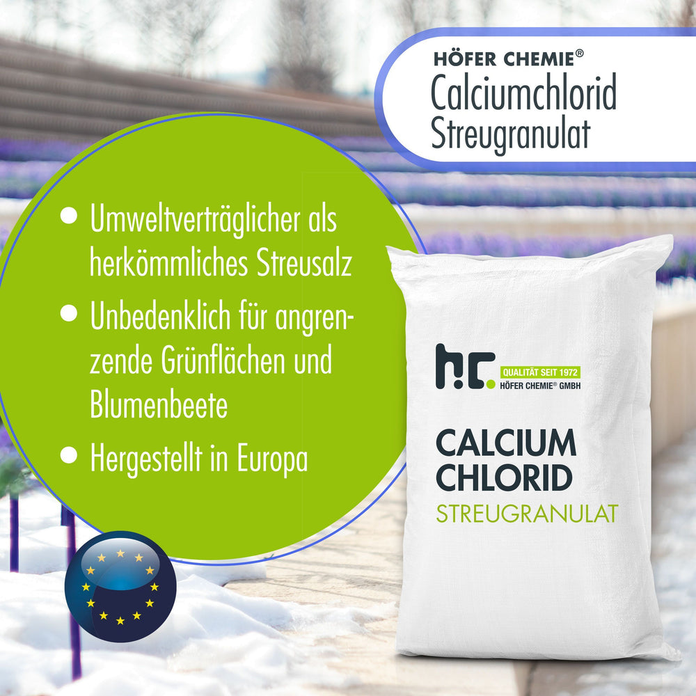 Calciumchlorid wird als schnell wirksames und dabei hoch ergiebiges Streugranulat mit Langzeitschutz zur Vorbeugung oder Bekämpfung von Eis- und Schneeglätte eingesetzt. Anders als für Streusalz gibt eine kaum Einschränkungen in der Anwendung, weil Calciumchlorid als umweltfreundlich und gut verträglich gilt. Das Streugut von Höfer Chemie erhöht die Trittsicherheit auf Fußwegen, Einfahrten, Straßen, Betriebsgeländen, Parkplätzen usw. und ermöglicht ein sicheres Begehen im Winter. Außerdem wird Streugranulat mit Calcium Chlorid aufgrund der enthaltenen wasseranziehenden Substanz zur natürlichen Luftentfeuchtung eingesetzt.