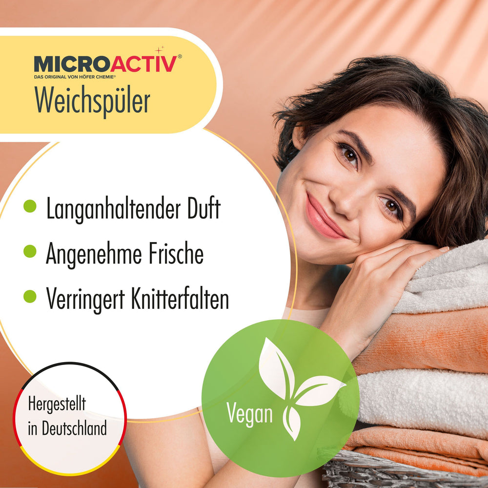 Höfer Chemie führt im günstigen Onlineshop stets abwechslungsreiche Angebote zu pflanzenbasiertem veganem Bio Weichspüler mit herrlich frischem Duft, welcher lange in der sauber gewaschenen Wäsche hält.