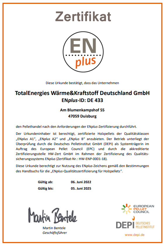 Die hochwertigen Original Holzpellets von TOTAL ENergies aus dem Höfer Chemie Onlineshop besitzen die Qualitätsstufe ENplus A1. Bei einer geringeren Güteklasse kann es bei Heizpellets dazu kommen, dass diese mehr Wasser enthalten, was beim Verbrennen zu einer übermäßigen Rauchentwicklung führt. Der Abrieb beim Transport der Pellets Sackware ist bei der Güteklasse ENplus A1 minimal, denn die Oberflächen sind sehr ebenmäßig gehalten. Mit dieser Qualitätsstufe wird eine Verschlackung bei der Verbrennung im Pelletofen vermieden, welche bei Holzpellets minderer Qualität zu Problemen beim Heizen führen kann. Insgesamt gelten EU-weit drei Güteabstufungen für Heizpellets: