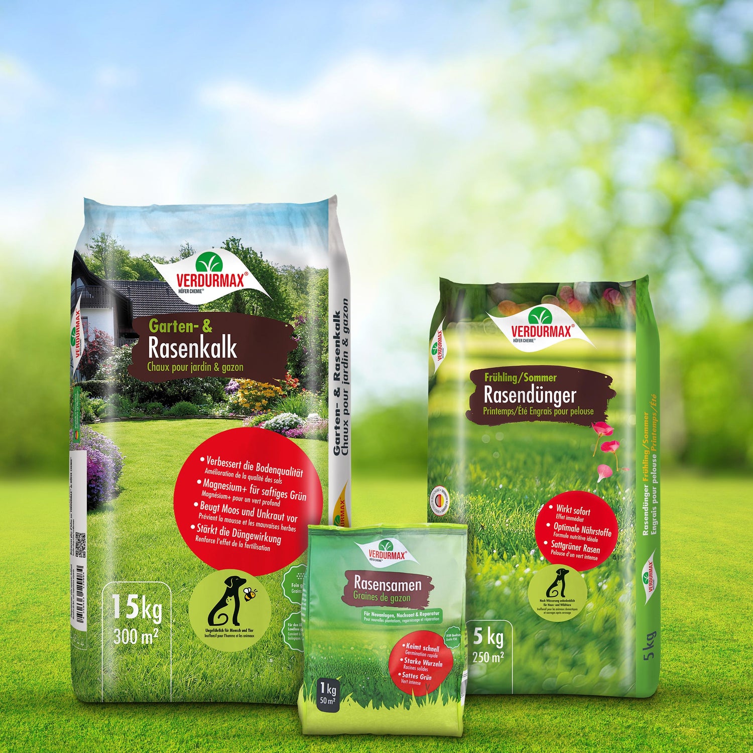 Mit dem VERDURMAX® Frühlings-Set erhalten Sie eine durchdachte Komplettlösung für die effektive Rasenpflege im Frühjahr. Die perfekt aufeinander abgestimmte Kombination aus Rasenkalk, Dünger und hochwertigen Rasensamen sorgt für eine schnelle Startwirkung und macht Ihre Rasenfläche innerhalb weniger Wochen sichtbar dichter, grüner und strapazierfähiger.