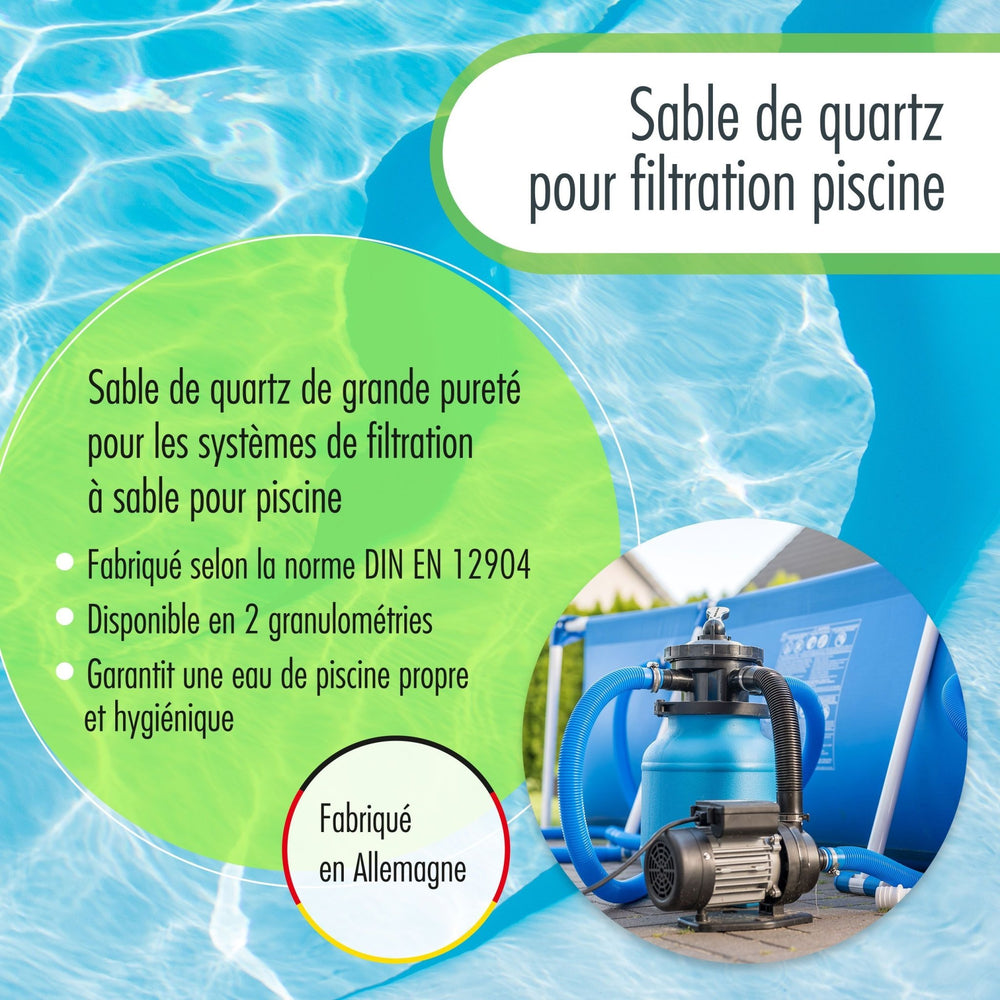 Pour que votre piscine reste propre & hygiénique, vous devez faire circuler l'eau quotidiennement à l'aide d'une pompe. Les impuretés sont retenues dans le sable et donc filtrées de l'eau. Lors du rétrolavage, ces impuretés sont ensuite évacuées du sable. Pour connaître la quantité de sable de filtration nécessaire, veuillez consulter le mode d'emploi de votre installation de filtration.