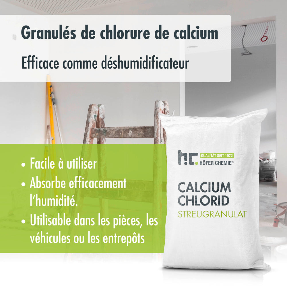 Le chlorure de calcium économique sans frais de livraison supplémentaires de la boutique en ligne de Höfer Chemie peut être appliqué partout où il y a de la poussière indésirable. Dans les caves humides, les greniers ou les zones d'habitation, ce produit chimique inodore de qualité technique peut également être utilisé comme déshumidificateur d'air pratique.