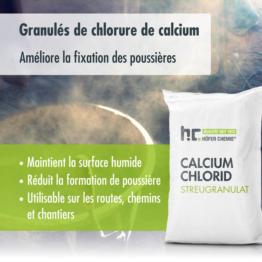 Le chlorure de calcium est un produit d'épandage écologique qui empêche le (re)givrage des chemins et des routes. Dans la boutique en ligne de Höfer Chemie, vous pouvez acheter le sac économique de 25 kg à un prix avantageux tout au long de l'année. Sur les routes non goudronnées, le chlorure de calcium est appliqué après la fonte des neiges au printemps et empêche ensuite l'apparition de poussière pendant tout l'été s'il est utilisé correctement. La fixation de la poussière dans l'eau permet d'éviter la présence de particules de poussière dans l'air. En hiver, le chlorure de calcium présente l'avantage d'être chimiquement réactif avec l'eau, ce qui permet d'abaisser le point de congélation de l'eau à des températures négatives à deux chiffres.