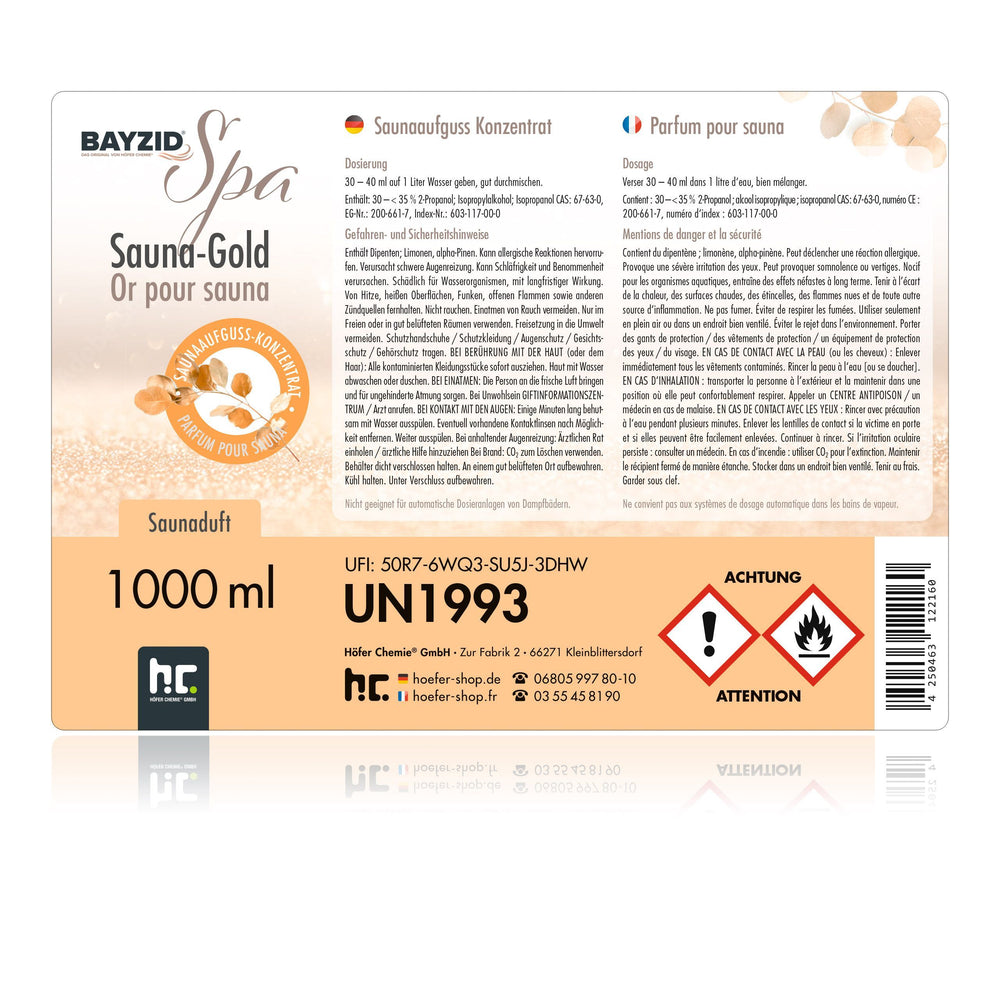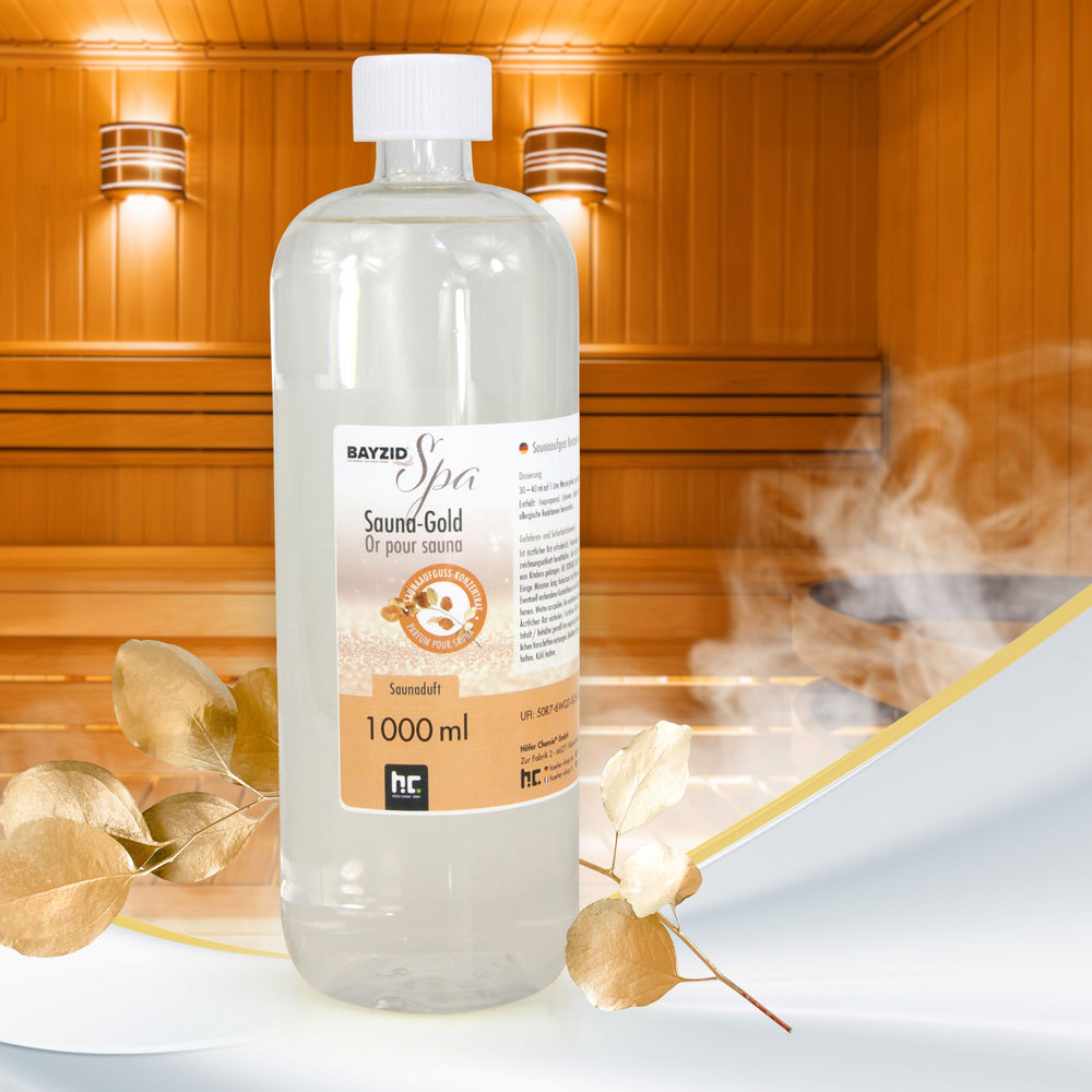 Parfum de sauna BAYZID® SPA - Or pour sauna en bouteille de 1 L 1 L Saunaaufguss Sauna Gold
