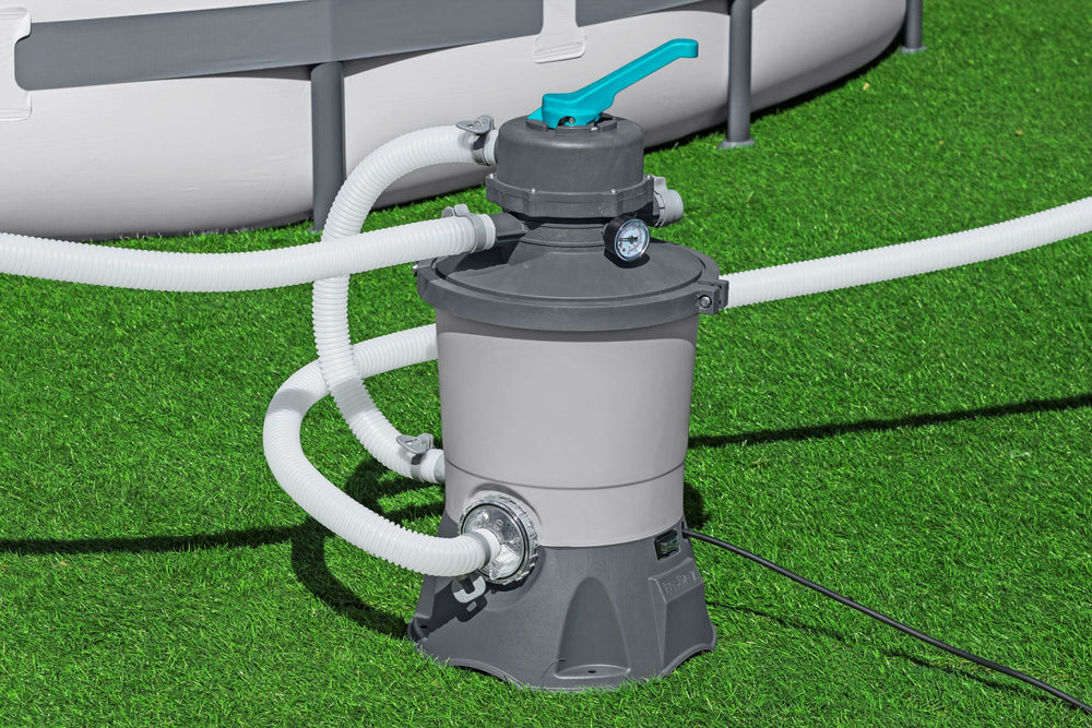 Le système de filtration à sable est doté d’un raccord de 32 mm et de deux tuyaux de 4,5 mètres pour une intégration facile à votre installation de piscine. Les buses d’entrée et de sortie fournies permettent une mise en service immédiate.