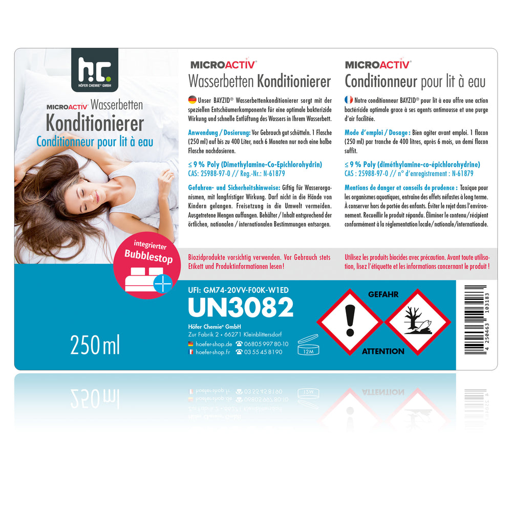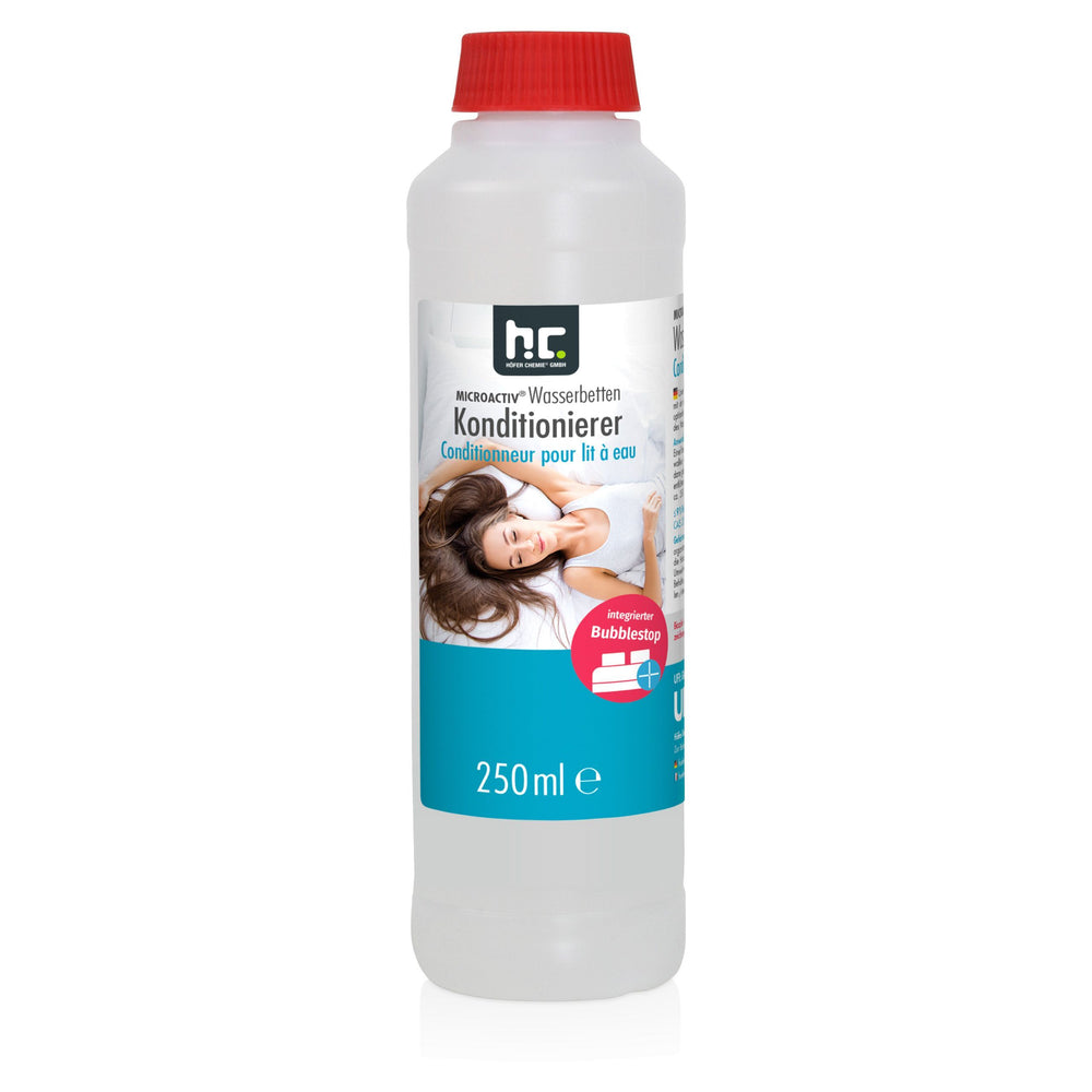 Lors de l'utilisation du conditionneur Microactiv® pour lits à eau, il est possible d'utiliser soit un flacon entier après environ 12 mois, soit la moitié du produit si l'eau est changée plus tôt, tous les 6 mois. Une bouteille entière suffit pour un matelas d'eau d'un volume de remplissage allant jusqu'à 400 litres.