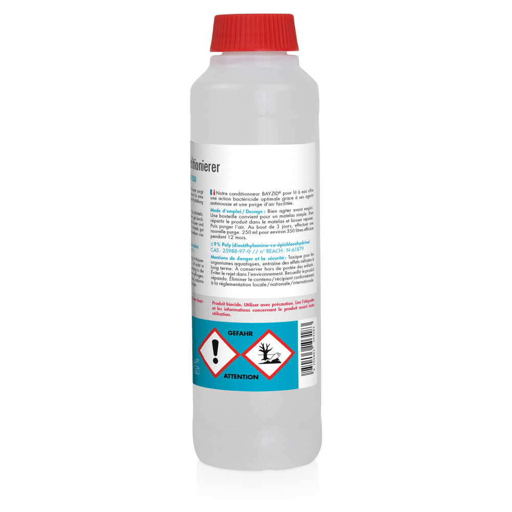 Le conditionneur pour lit à eau BAYZID ® empêche de manière fiable la prolifération des bactéries, des champignons et des algues au cœur de votre matelas à eau et entretient le vinyle de l'intérieur. Mais la formation gênante de bulles et le bouillonnement de l'eau appartiennent également au passé grâce aux additifs inhibiteurs d'air qui fixent l'oxygène.
