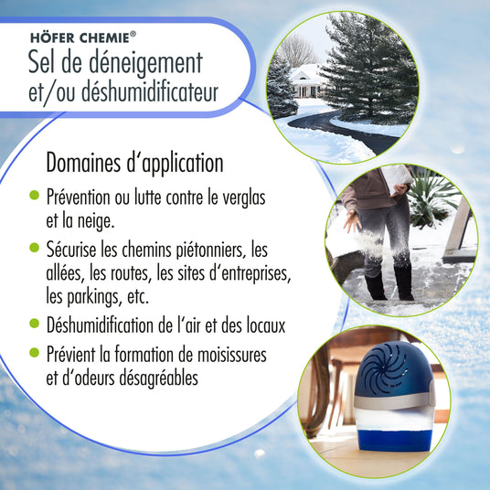 Comparé au sel d'épandage ordinaire, il est nettement plus respectueux de l'environnement pour les plantes, les animaux et pour la protection des nappes phréatiques. Après l'application de chlorure de calcium en granulés Höfer Chemie, la neige fond plus rapidement et la glace des chemins et des routes fond rapidement. En marchant sur les chemins déneigés, les chaussures ne présentent pas de traces de sel. En circulant sur les routes traitées au chlorure de calcium de Höfer Chemie, le soubassement des voitures et leur peinture sont protégés des dommages causés par le salage. Les granulés à haut rendement contribuent à réduire la poussière, à empêcher la présence de particules de poussière dans l'air et à maintenir fermement les petites pierres dans le sol, ce qui permet de minimiser le risque de chutes de pierres.