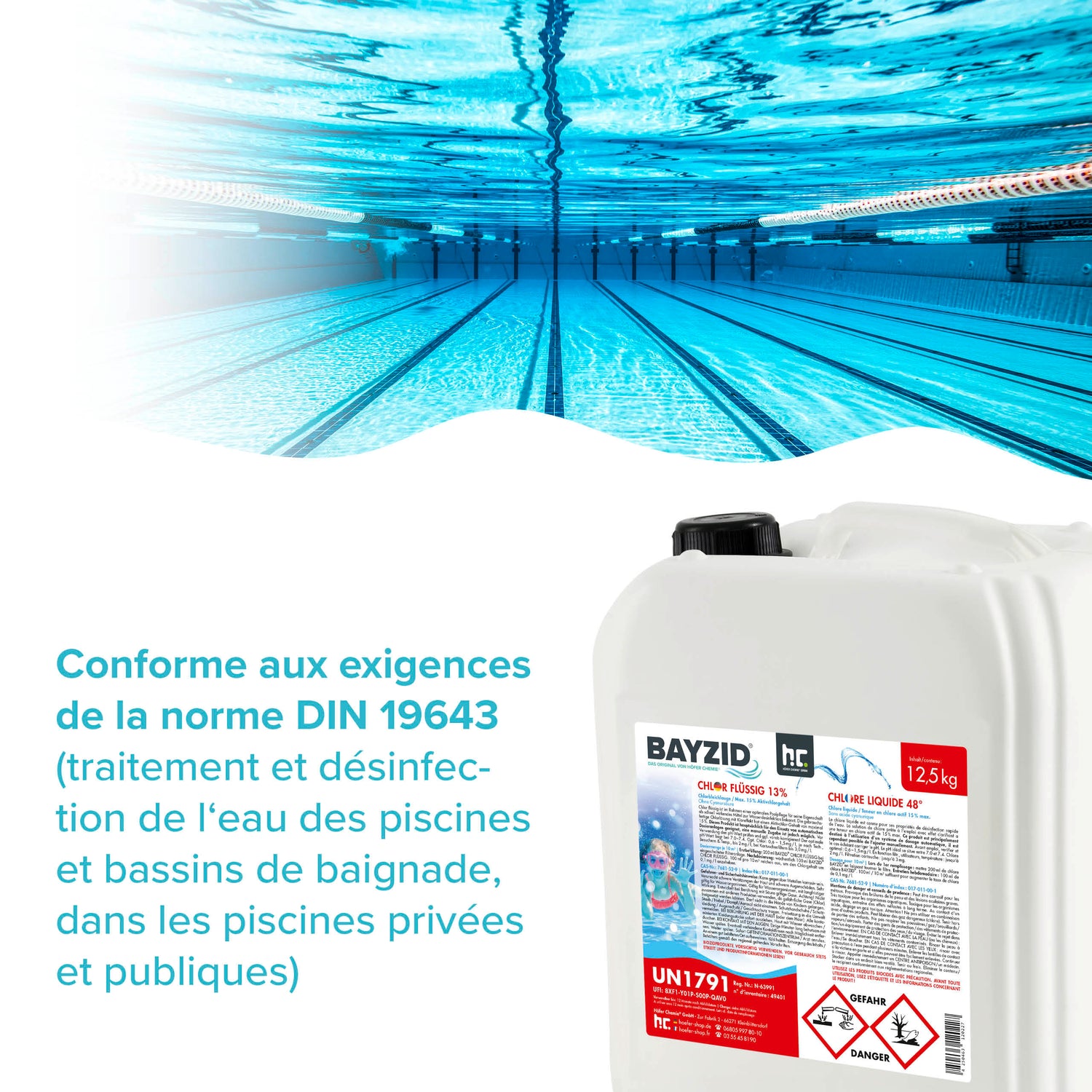 Notre chlore liquide BAYZID® n'est pas seulement très efficace, il est également livré rapidement et confortablement à domicile. Grâce à la solution prête à l'emploi contenant 13 à 15 % de chlore actif, vous pouvez alimenter votre piscine en chlore, qui est également utilisé pour les piscines publiques, car il a été fabriqué conformément à la norme DIN19643 (homologation pour le secteur public). Dimensions du bidon : H 30 cm, L 23 cm, L 20 cm.