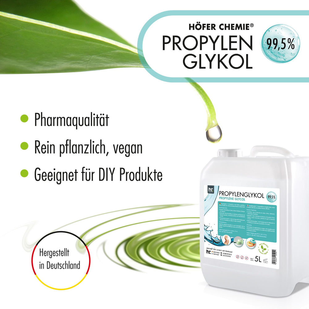 Das chemisch reine Propylenglykol 99,5 % von Höfer Chemie überzeugt durch seine hohe pharmazeutische Qualität und vielseitige Verwendbarkeit in Kosmetik, Technik und Industrie. Als farblose, geruchlose und viskose Flüssigkeit eignet sich dieses Monopropylenglykol (1,2-Propandiol) hervorragend als Lösungsmittel, Feuchthaltemittel und Trägerstoff für zahlreiche Anwendungen.