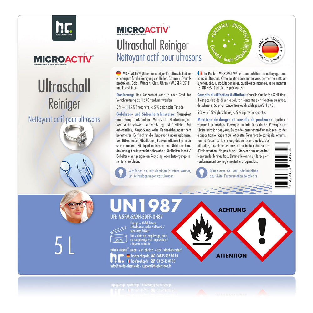 Der Microactiv® Ultraschallreiniger von Höfer Chemie eignet sich für die Anwendung in jedem namhaften Ultraschallbad. Testen Sie unser bestes Ultraschall-Reinigungsmittel mit optimaler Reinigungskraft doch einfach selbst einmal und bestellen Sie Höfer Chemie Ultraschallreiniger bequem online - völlig ohne Versandkosten.